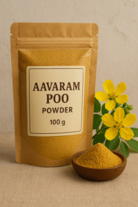 Aavaram Poo (Senna auriculata) is a traditional herb celebrated in Tamil Nadu for its cooling, detoxifying, and skin-brightening properties. Our Aavaram Poo Powder is made from freshly harvested Aavaram flowers, naturally sun-dried and finely ground to preserve its nutrients. This 100% natural powder helps purify the blood, improve skin glow, and regulate body heat — making it a perfect addition to your daily wellness routine.